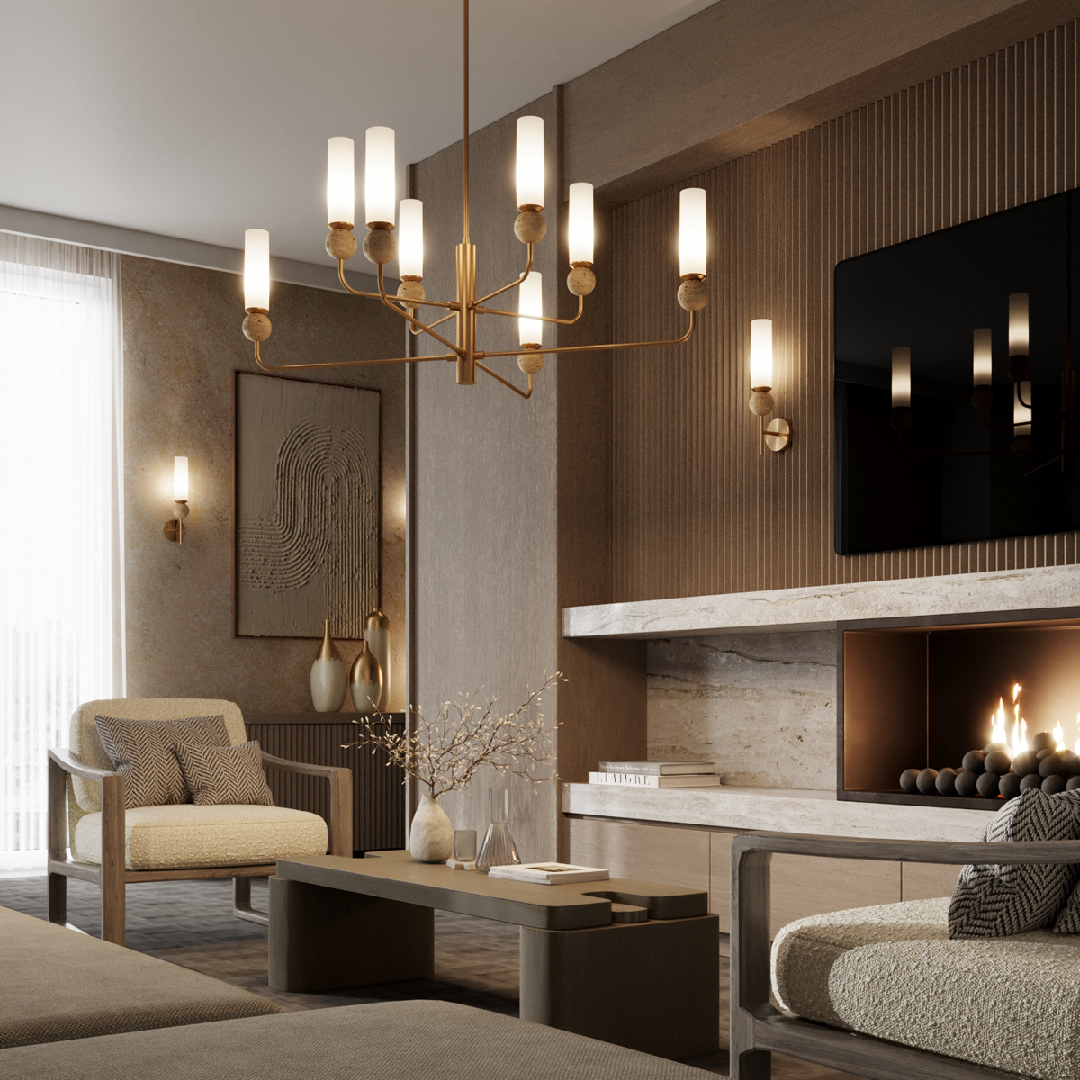 Линия Lolla - сочетание элегантной геометрии и природности материалов. В люстре используется камень травертин, эффектно сочетающийся с металлом под латунь и вытянутым плафоном из стекла.