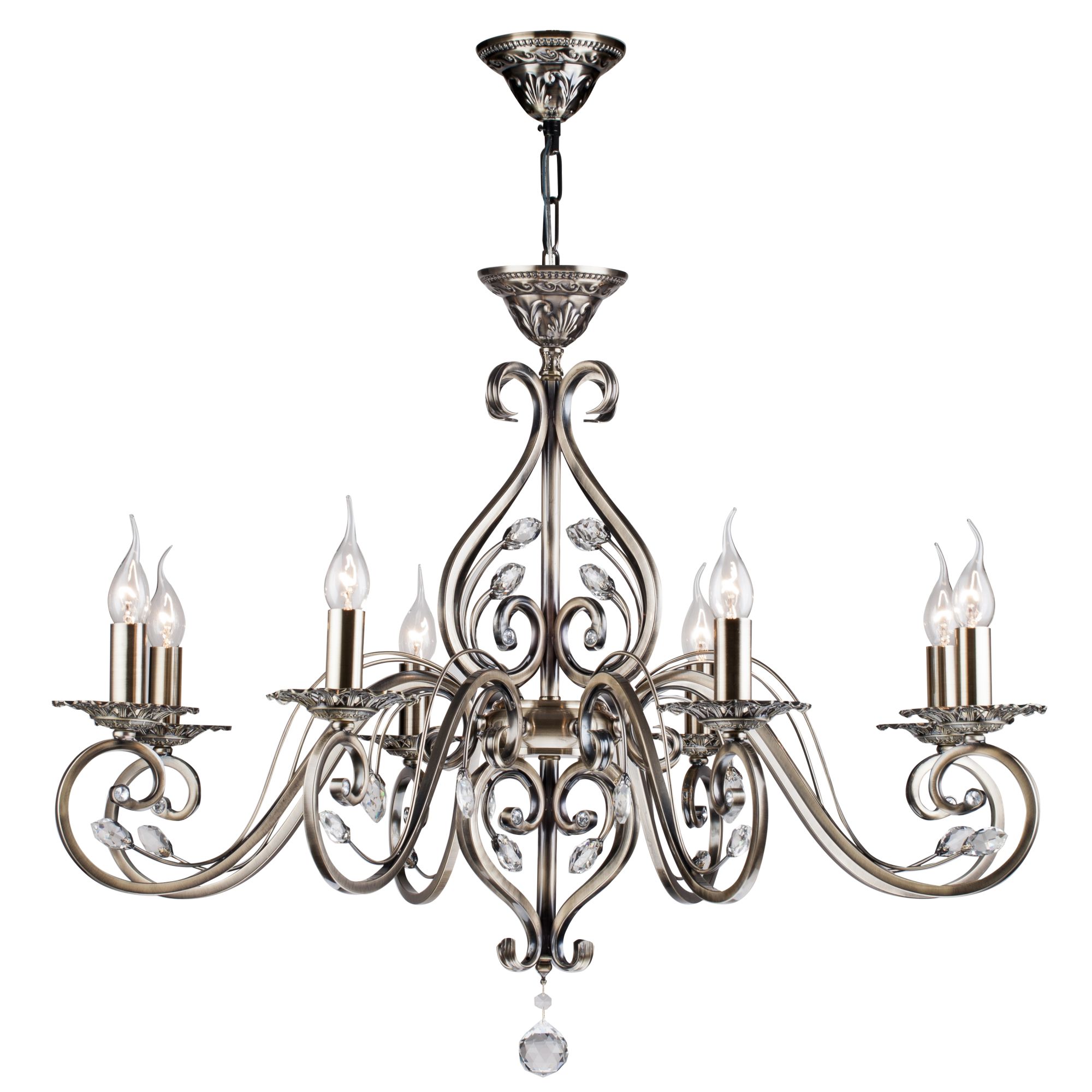 Флористическая тематика прослеживается в декоративных элементах и силуэтах светильников серии. Изящные витиеватые линии каркаса украшены граненными кристаллами в форме лепестков. Арматура изготовлена из металла бронзового цвета. Блюдца на рожках имеют небольшие просечные отверстия, через которые проходит свет ламп, выявляя ажурный контур. Высоту люстр возможно изменять, регулируя длину цепи.