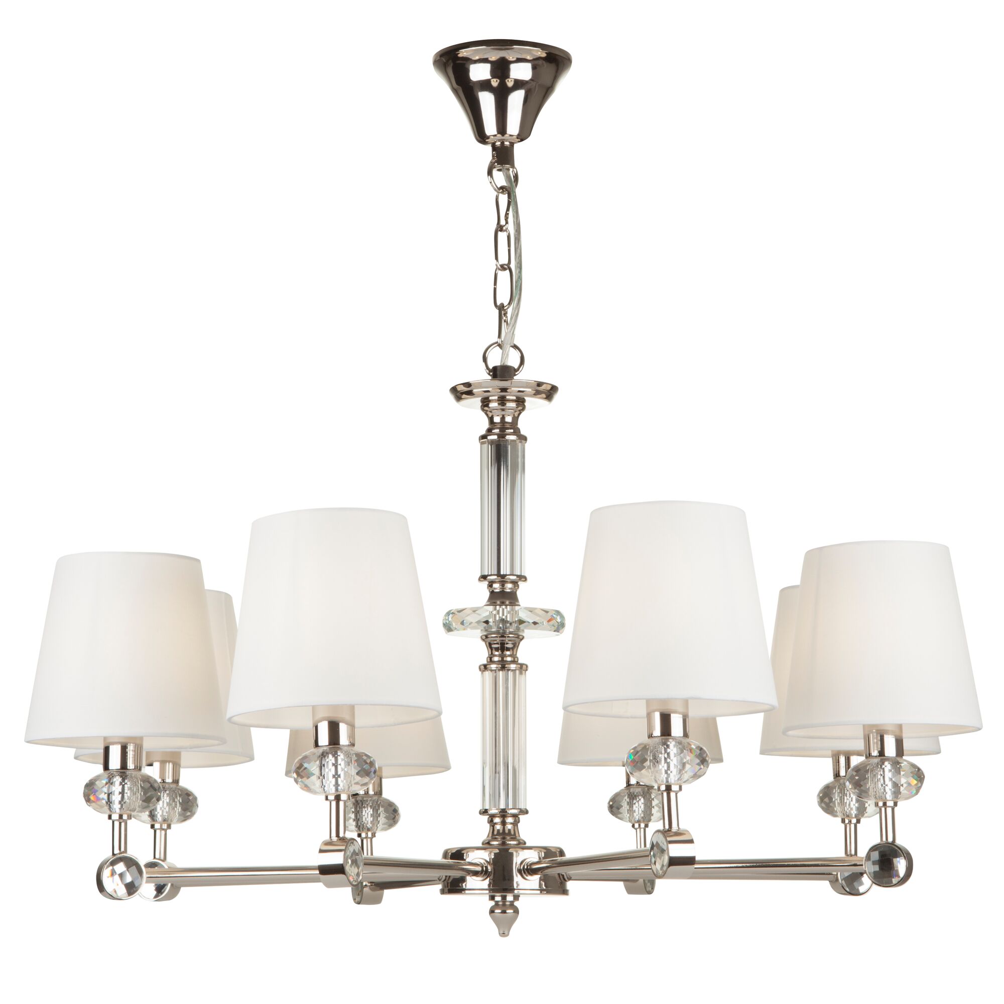 Материал арматуры – нержавеющая сталь, цвет – хром. Материал абажуров – текстиль на ПВХ, цвет – белый. Декор – прозрачное стекло. Акцентные стеклянные кристаллы на рожках со сложной огранкой.