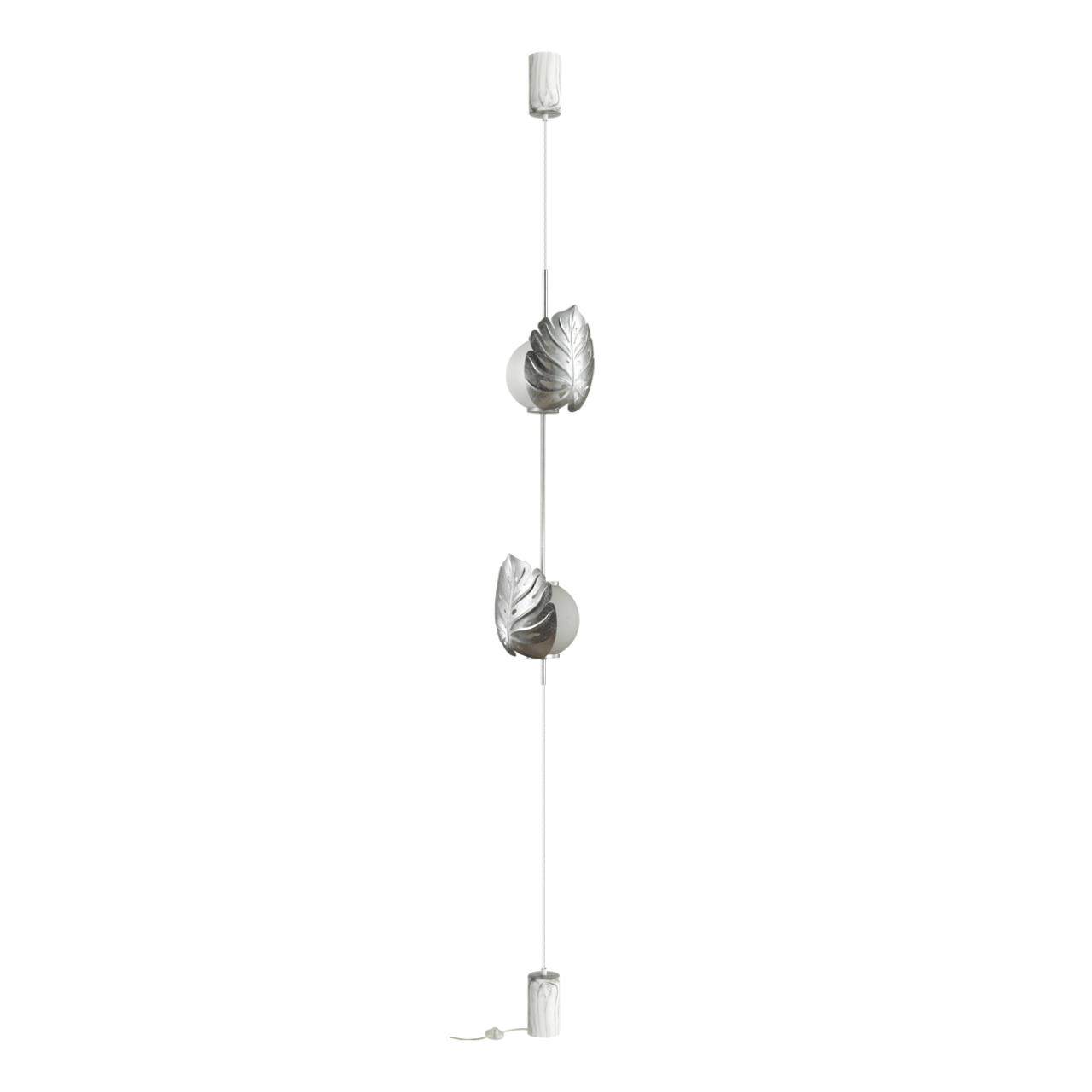 Линия Jungle выполнена в стиле эко-роскошь или эко-шик, для которых характерны природные мотивы и роскошное декорирование в виде золотого и серебряного покрытия. В качестве главного декоративного элемента в серии выступает стилизованный лист монстеры, покрытый золотым или серебряным фольгированием. Особое место в линии Jungle занимает натяжной торшер, при помощи которого можно сделать световой акцент, зонирование пространства, эффектное украшение и комфортное освещение интерьера одним светильником! Высоту торшера можно менять с помощью регулировки длины провода. Коммутацию торшера можно осуществлять как с потолка , так и вынести через нижнюю чашу провод с выключателем (оба варианта коммутации идут в комплекте).