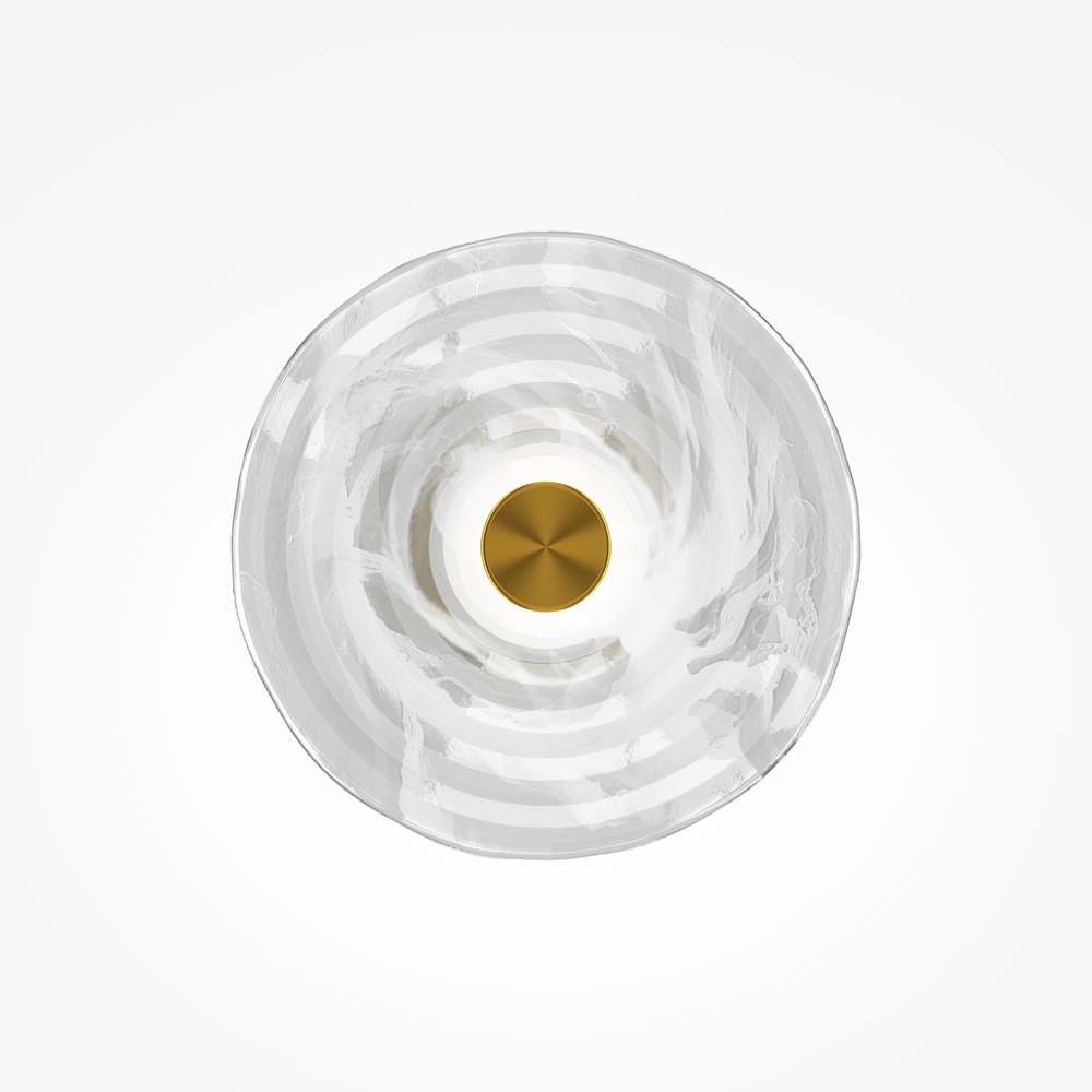 Металлическая арматура, цвет - латунь. Декоративные плафоны из литого стекла. Они рассеивают свет и дают легкие блики на стенах. Стекло плафонов может быть прозрачным или тонированным с паттерном молочного оттенка. Встроенный LED-источник света имеет цветовую температуру 3000 К, угол рассеивания — 120 градусов.