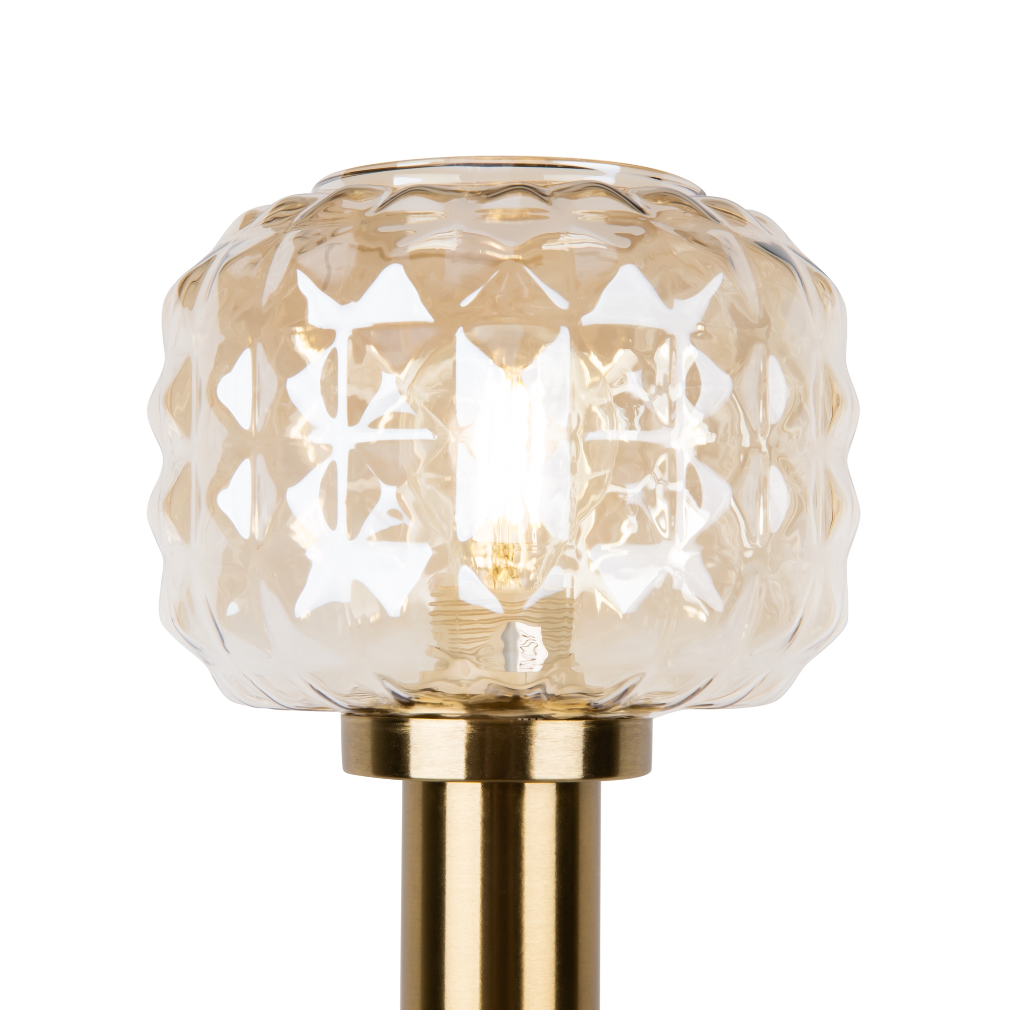 Металлическая арматура в цвете латунь. Плафоны из толстого рельефного стекла в оттенке амбра с «шипованной» огранкой. Подвесные модели регулируется по высоте. Источник света - лампа с цоколем Е14