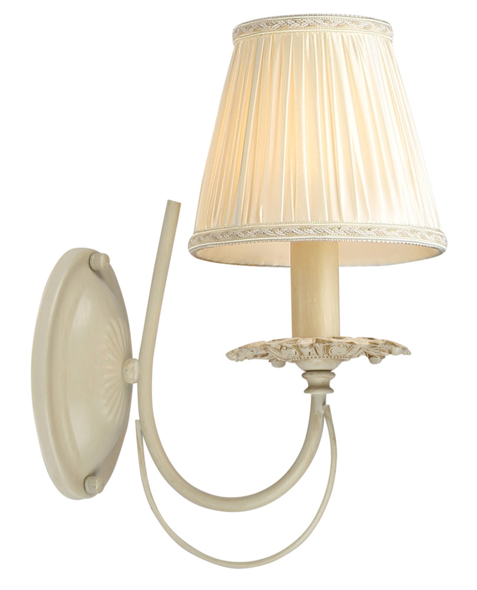 Арматура из металла оттенка слоновой кости. Абажур – плиссированная органза, цвет – кремовый. Окантовка золотистой тесьмой. Оригинальные двойные рожки. Резной декор.