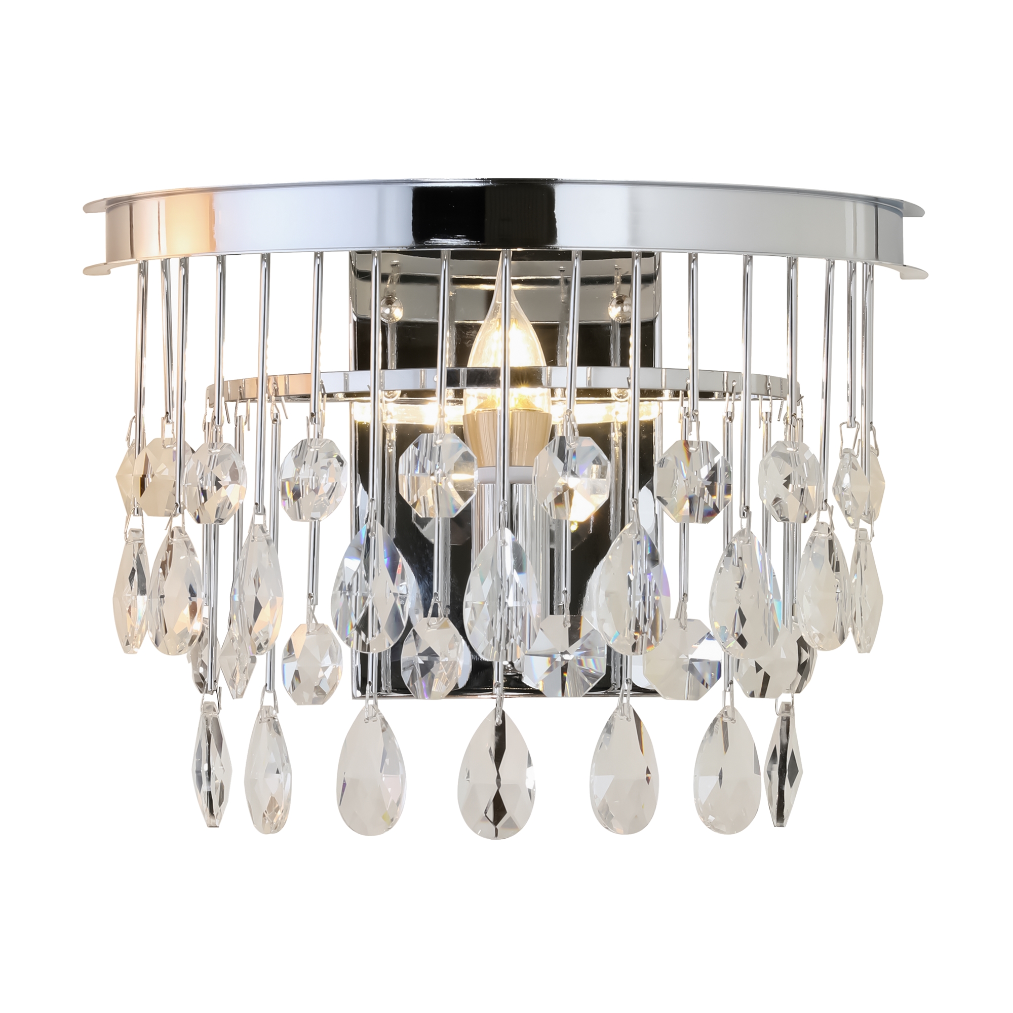 Материал арматуры – металл, оттенки – золото и хром. Комбинация металла и хрусталя в декоре. Металлические трубки гальванизированы в тон арматуре. Хрустальные подвески обрамляют композицию. Высота люстр регулируется с помощью цепи. Цоколь Е14.