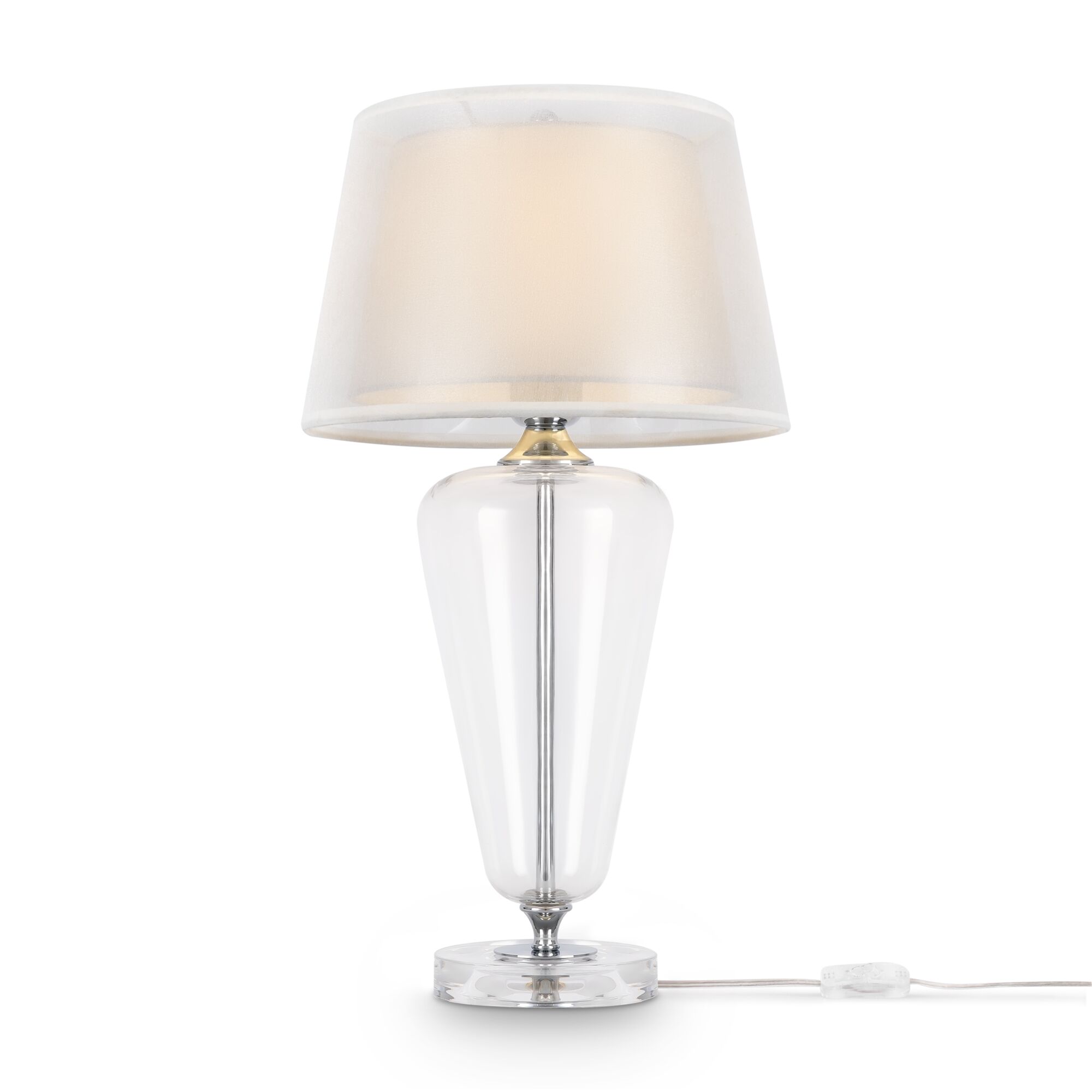 Арматура – металл, оттенки – латунь, хром. Двойной абажур, текстиль 2 видов: лен, полупрозрачная органза. Прозрачные элементы: выдувное стекло, литой акрил в основании.