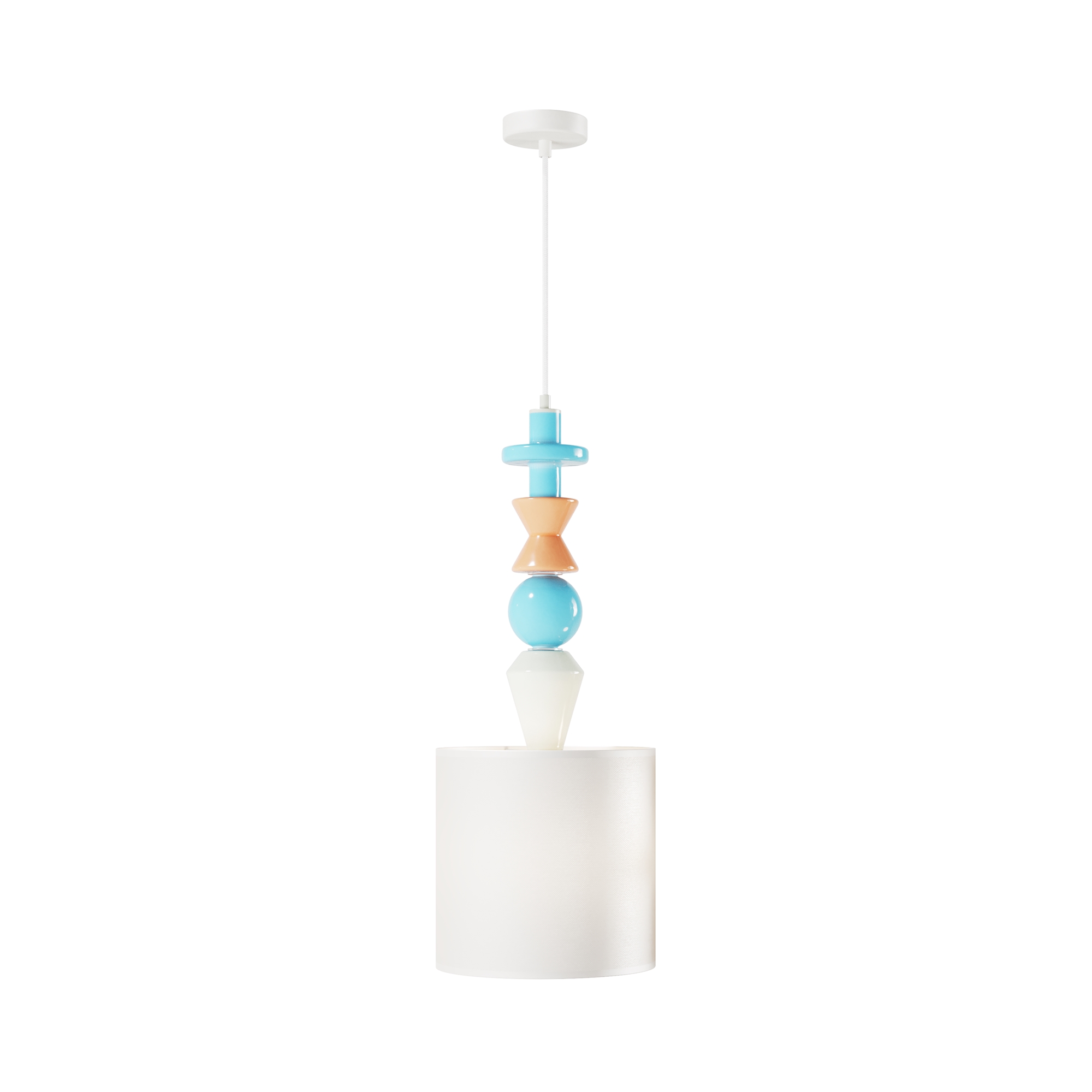 Арматура из металла, цвет - белый. Абажур выполнен из натуральной ткани, цветные декоративные элементы в пастельных тонах — из керамики. Белый абажур имеет классическую цилиндрическую форму, ткань дает мягкий рассеянный свет. Светильники комплектуются сменными лампами с цоколем Е27 (не входят в комплект). Провод подвесного светильника можно регулировать по длине. Декор напоминает стилистику крафтового искусства