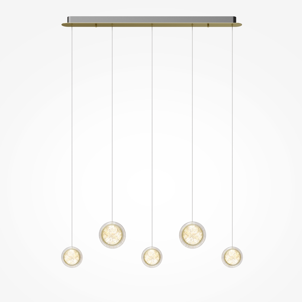 Арматура из металла цвета латунь с сатинированным финишным покрытием сочетается с прозрачными плафонами. Подвесные одинарные, горизонтальный и каскадные светильники оснащаются LED-модулем с двумя плоскими плафонами из акрила со сложным, актуальным паттерном на поверхности. Цветовая температура — 3000К, угол рассеивания — 125 градусов.