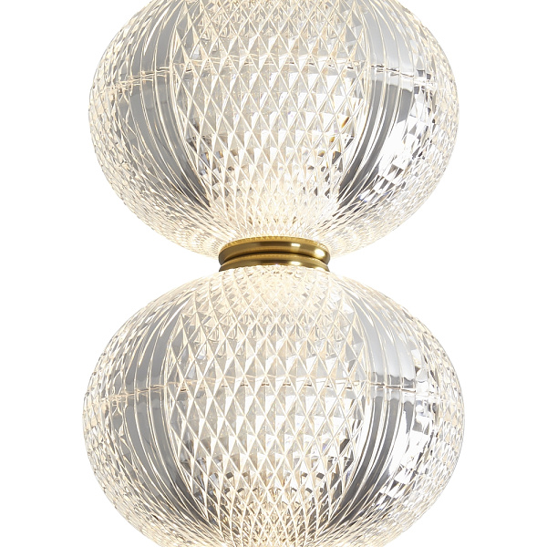 Арматура выполнена из металла в цвете латунь. Прозрачные плафоны. Вертикальные и горизонтальные подвесные светильники разных размеров. LED источник света. Цветовая температура 3000К.