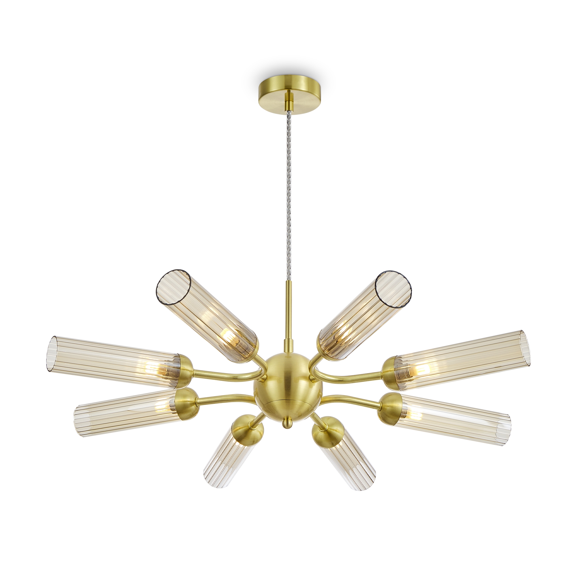 Арматура из металла, цвет — золото. Рельефные плафоны в тренде ZIGZAG. Материал — стекло, цвет — янтарный. Высота подвесных светильников регулируется. Плафоны закреплены на металлическую сферу. Источник света — лампа с цоколем G9.