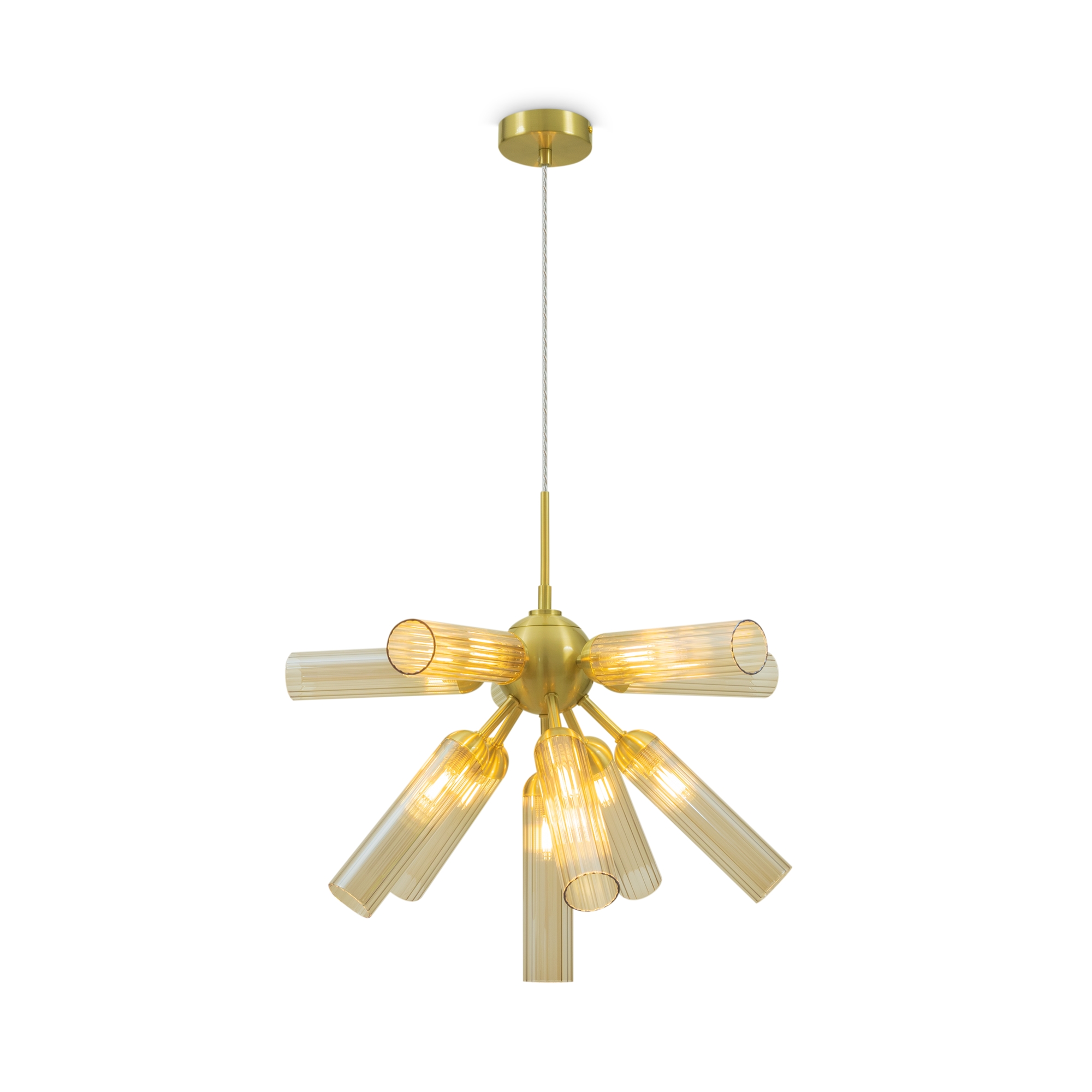Арматура из металла, цвет — золото. Рельефные плафоны в тренде ZIGZAG. Материал — стекло, цвет — янтарный. Высота подвесных светильников регулируется. Плафоны закреплены на металлическую сферу. Источник света — лампа с цоколем G9.
