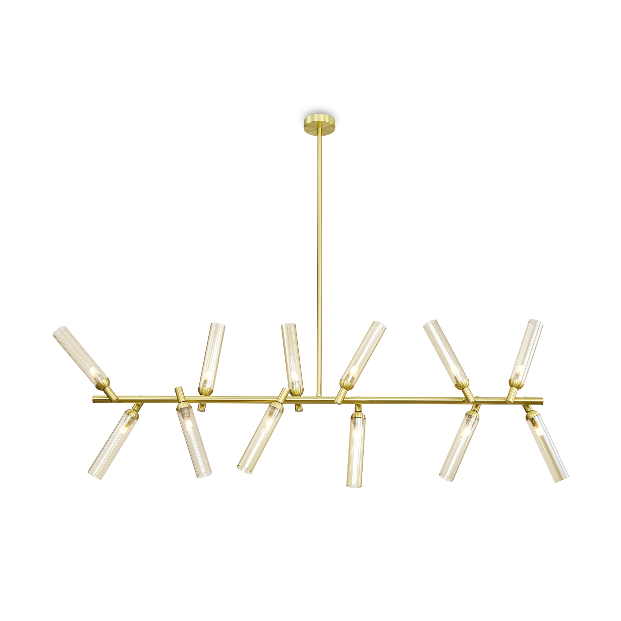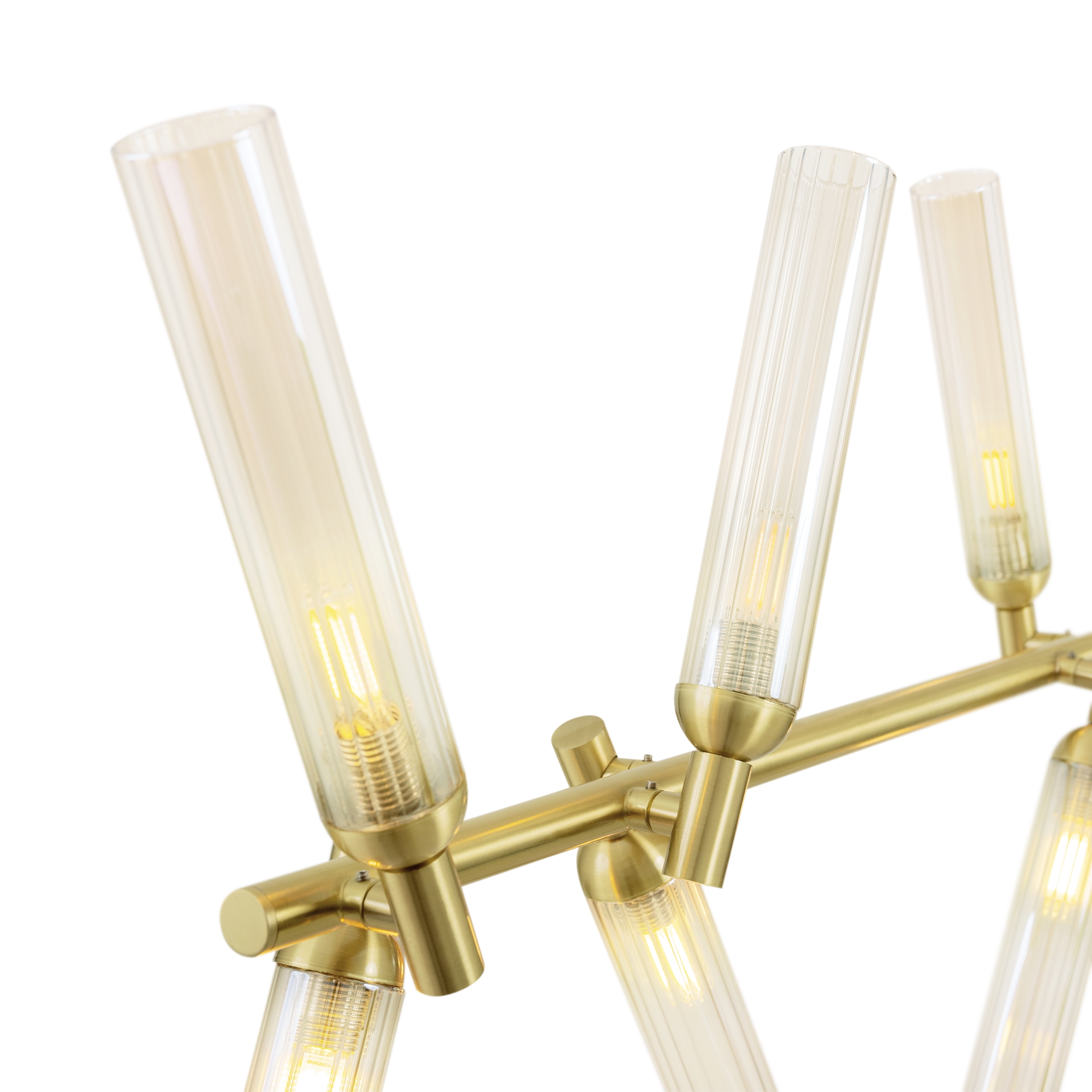 Арматура из металла, цвет — золото. Рельефные плафоны в тренде ZIGZAG. Материал — стекло, цвет — янтарный. Высота подвесных светильников регулируется. Плафоны закреплены на металлическую сферу. Источник света — лампа с цоколем G9.