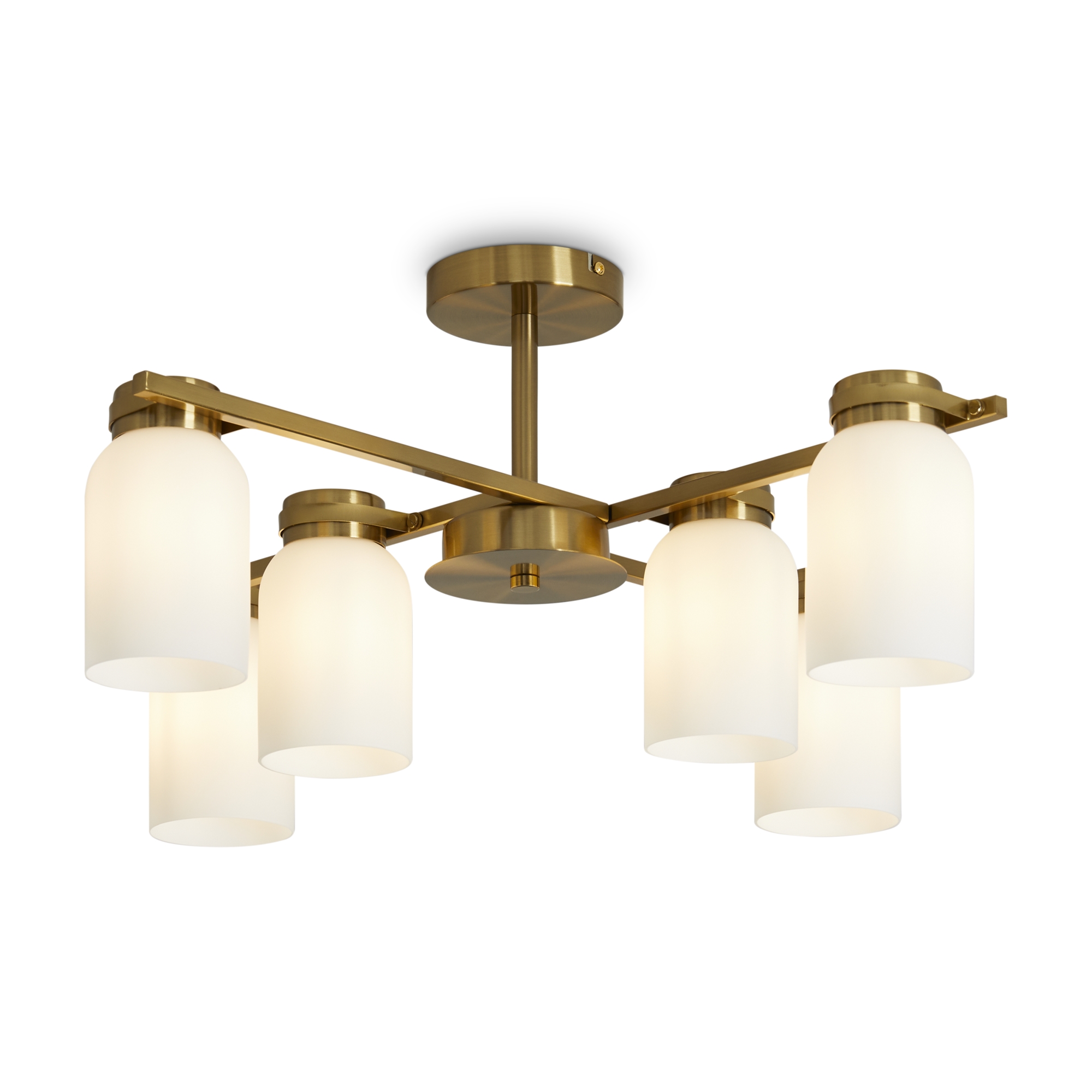 Арматура из металла. Цвет латунь. Плафоны из белого стекла новой необычной формы. Два варианта светильников — потолочные и бра. Подходит для помещений с низкими потолками. Источник света — лампа. Цоколь E14.