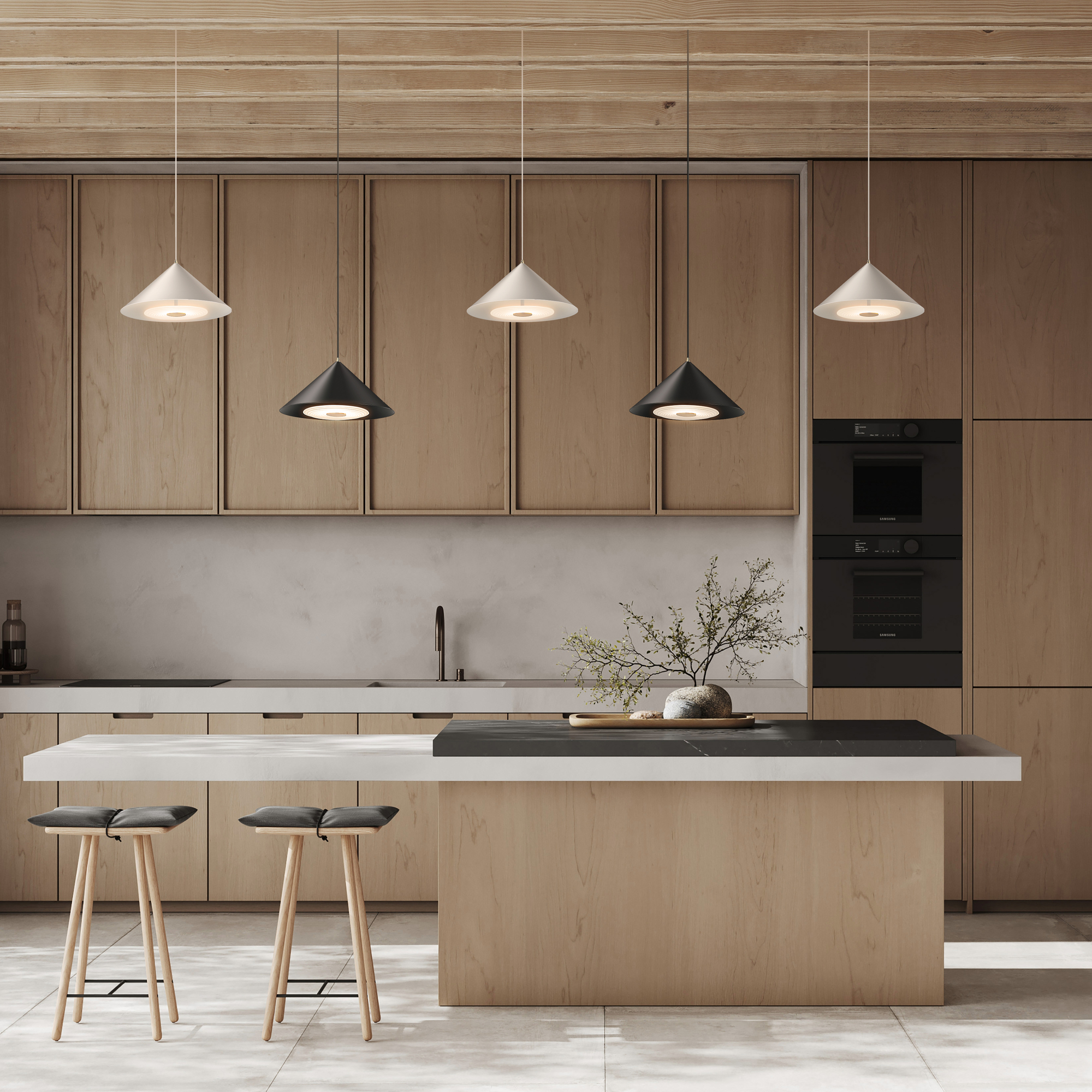 Металлическая арматура, цвета — чёрный и белый. Плафоны — конусовидные, среднего размера. Универсальный минималистичный дизайн, регулируемая высота. Светодиодный источник света. Цветовая температура — 3000К.