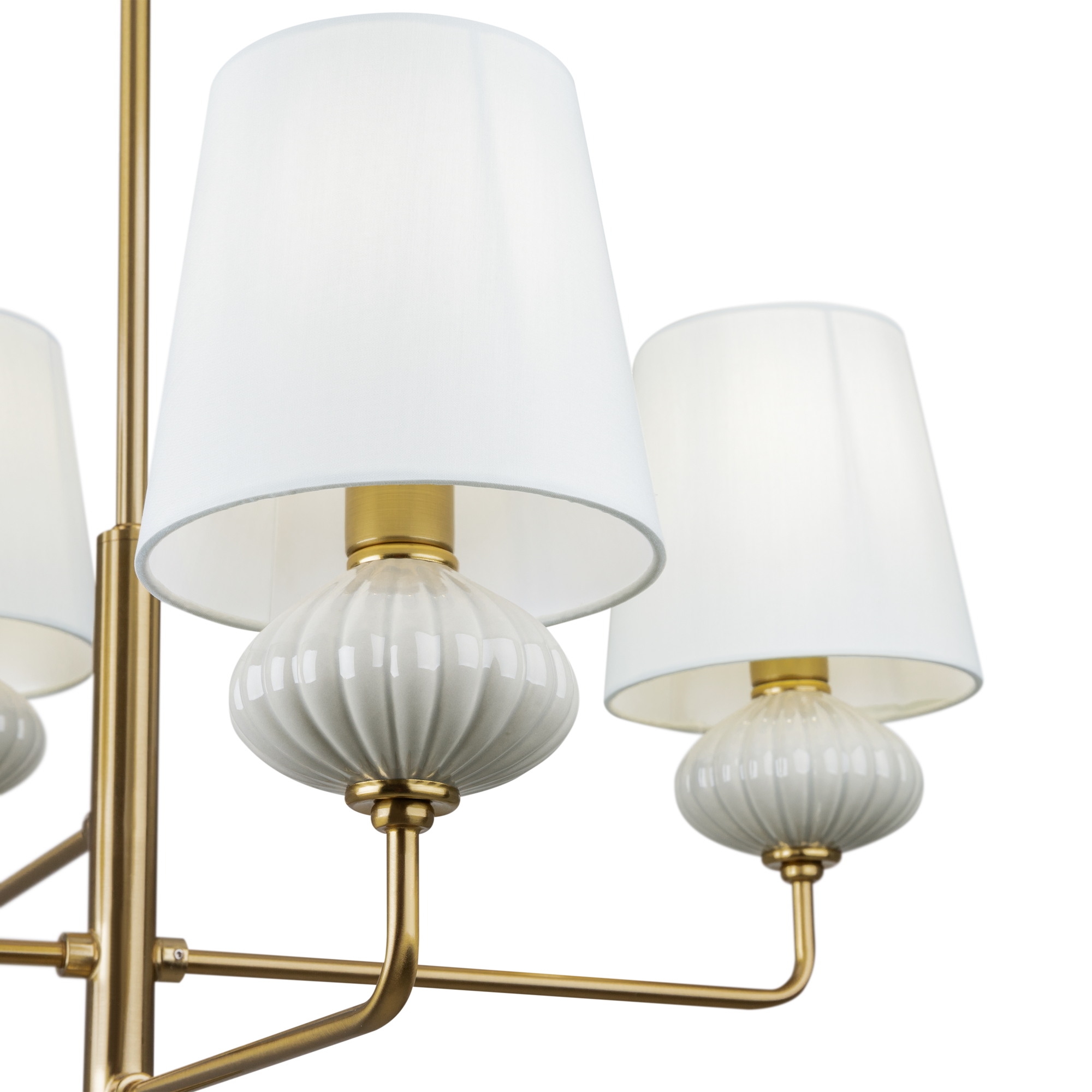 Металлическая арматура, цвет - латунь. Керамические декоративные элементы. Матовые белые абажуры. Силуэт светильника вытягивает интерьер. Источник света — лампа. Цоколь E14.
