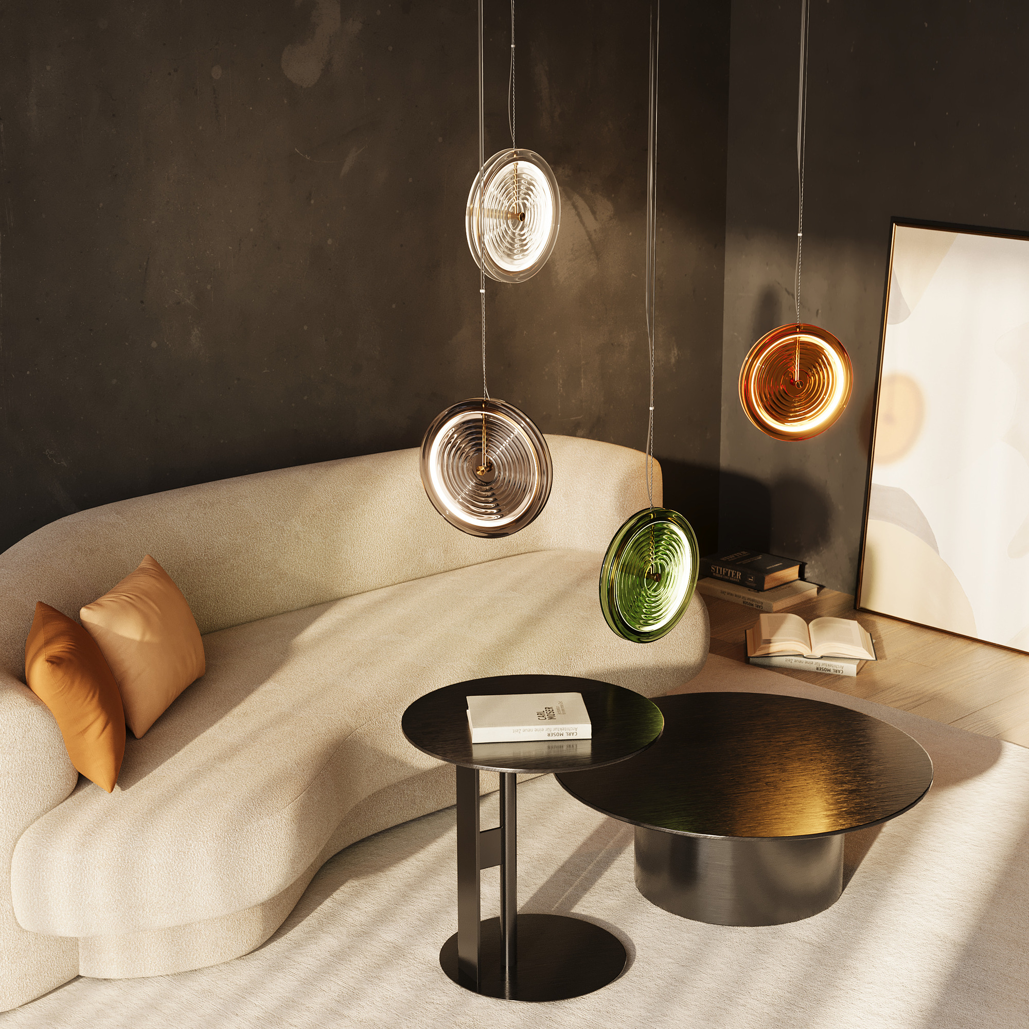 Арматура - металл. Цвет арматуры латунь. Плафоны из стекла в форме леденцов выполнены в четырех цветах: серый, зеленый, прозрачный и желто-оранжевый. Широкий спектр типов светильников: торшеры, настенные бра и подвесы. LED источник света. Цветовая температура 3000К.