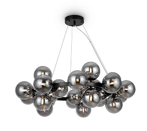 Металлическая арматура в четырех цветах: матовый черный, хром, золото, латунь. Плафоны — выдувное стекло. Цвета — дымчатый, янтарный, коньячный. Дизайн с имитацией молекулярной структуры. Высота подвесных светильников регулируется тросом. Лампа с цоколем G9.