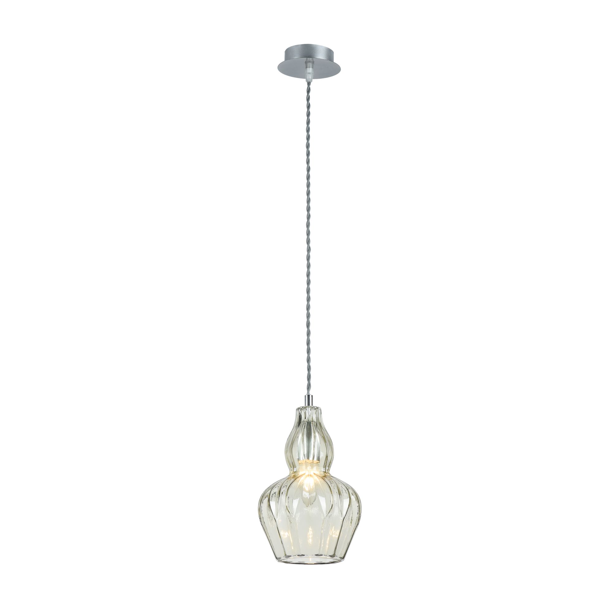 Арматура — металл, оттенок — никель. Рельефный плафон выполнен из стекла. Оттенки плафона — прозрачный и голубой. Витой провод. Регулируемая высота.