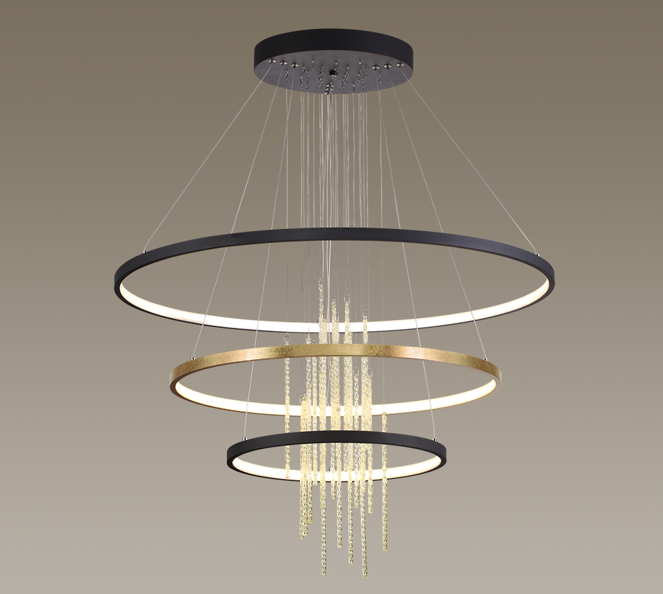 Линия Monica сочетает в себе роскошь и гламур золотого цвета, выполненного в технике фольгирования, и ... гармонию музыки ветра: каскад стеклянных трубочек в центре светильников при касании будет издавать лёгкий и приятный, словно шелест, звук. Подвесы могут состоять из двух и трех колец, в линии теперь есть потолочный светильник.