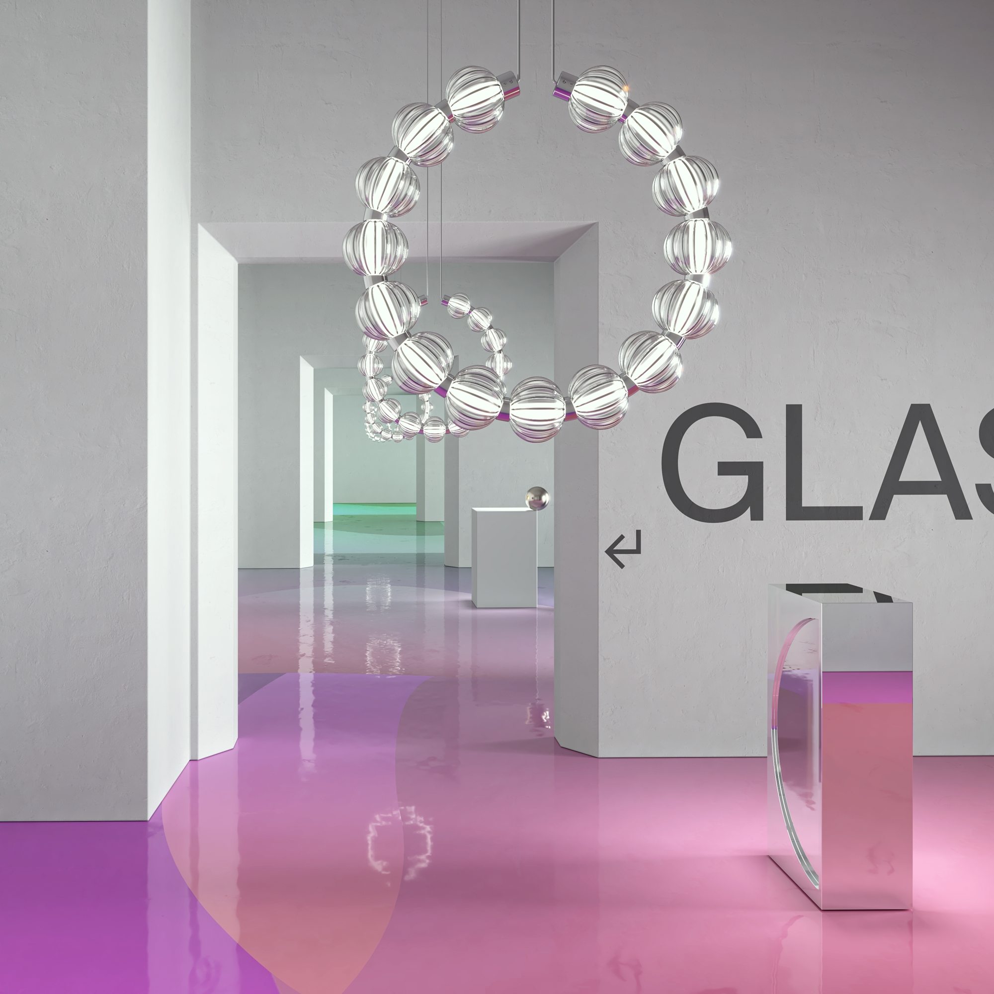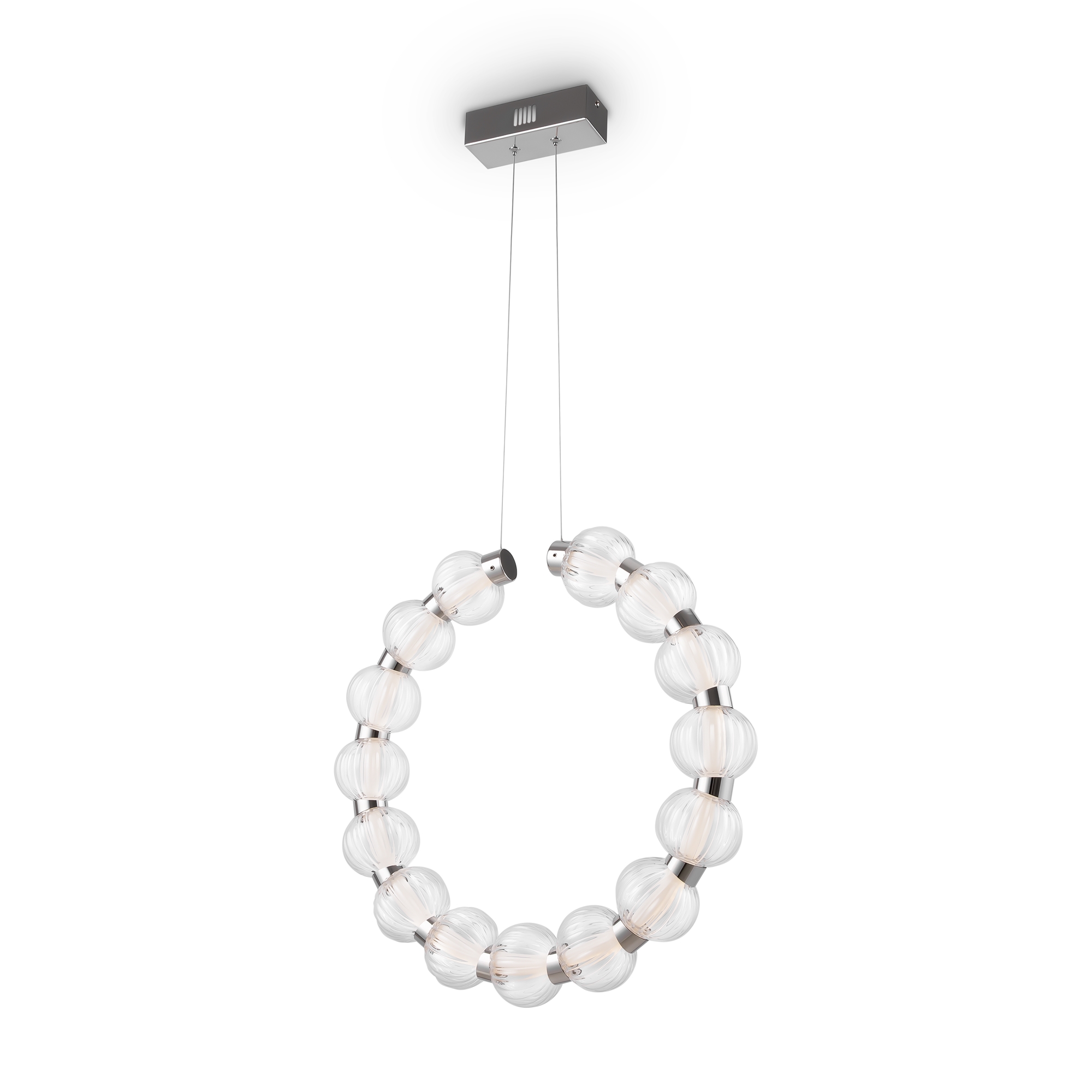 Арматура из металла, цвет – хром. Акцентный декор в виде рельефных сфер из литого стекла. Источник света – светодиодная лента – скрыта под акриловым рассеивателем. Регулируемая высота подвесных светильников.