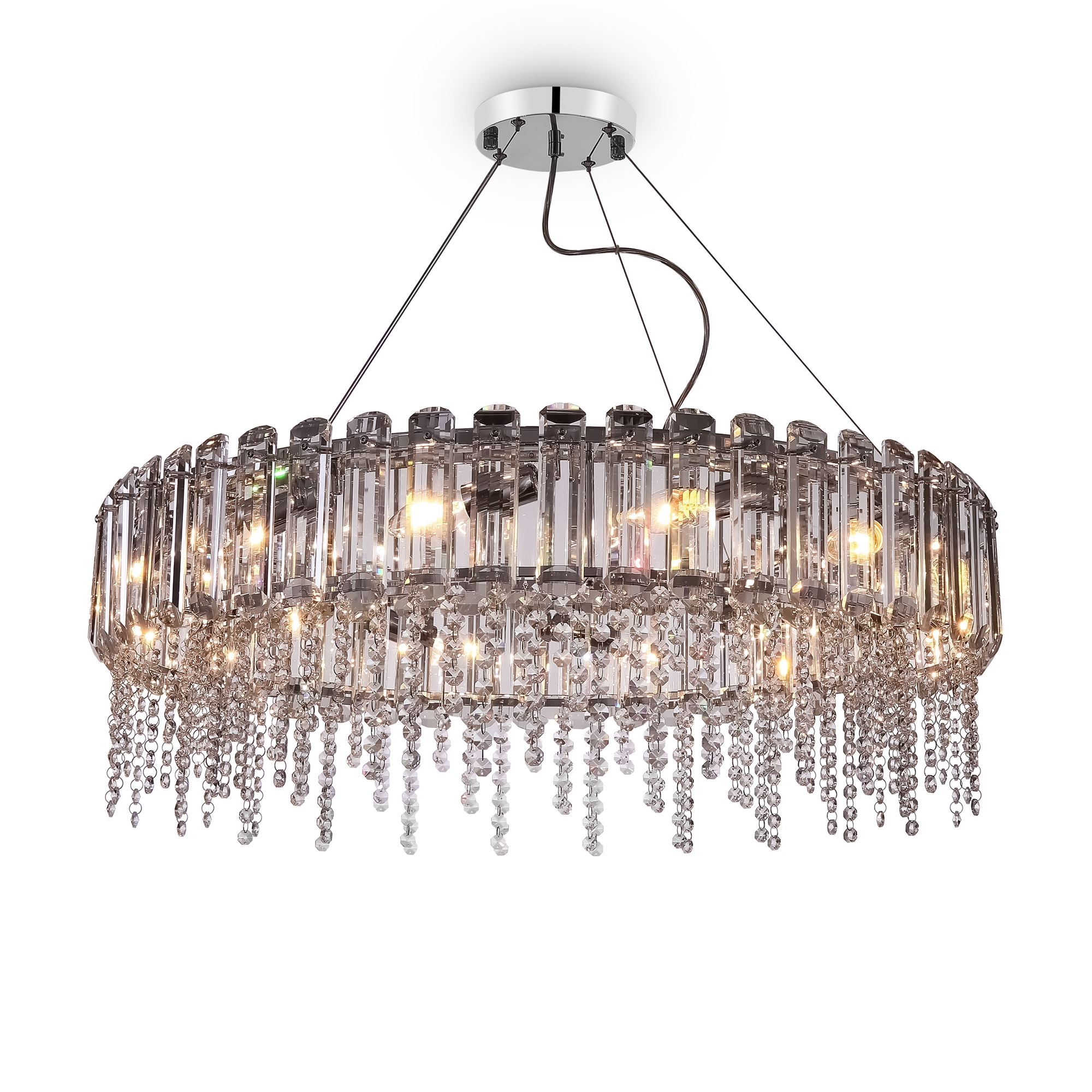 Арматура из металла, цвет – хром. Прозрачный хрустальный декор двух видов: крупный вытянутый по внешнему периметру и округлый на подвесках. Высота подвесных моделей регулируется. Цоколь Е14.
