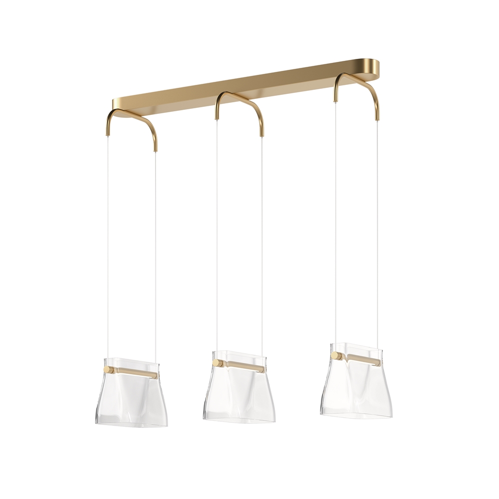 Цвет металлической арматуры — латунь с сатинированным финишем, плафоны — прозрачное стекло. Источник света: LED. Цветовая температура светильников 3000К, угол рассеивания — 120 градусов. Настенные бра и подвесные светильники оснащены регулируемым проводом длиной до 3 метров, что позволяет использовать их в помещениях с высокими потолками.