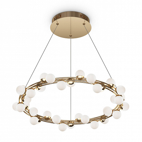 Арматура из металла в золотом цвете. Плафоны-сферы — белый пластик. Дизайн с имитацией молекулярной структуры. LED-источники света.