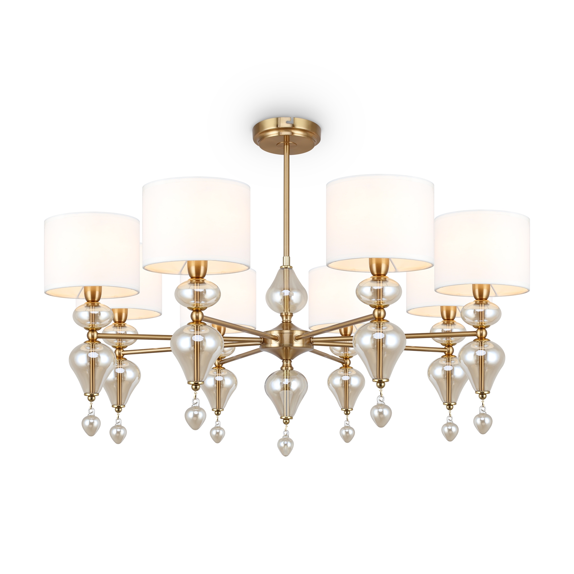 Арматура из металла, цвет — латунь. Плафоны — тканевые, молочного цвета. Металлическая конструкция декорирована выдувными стеклянными элементами с перламутровым напылением. Источником света служит лампа с цоколем Е14.